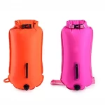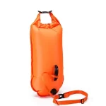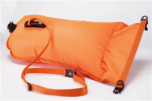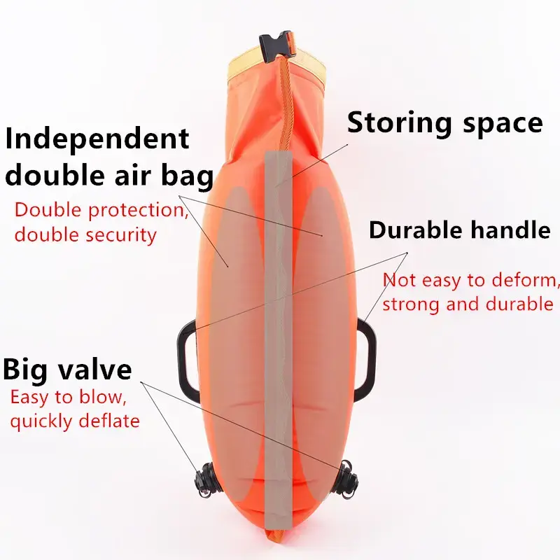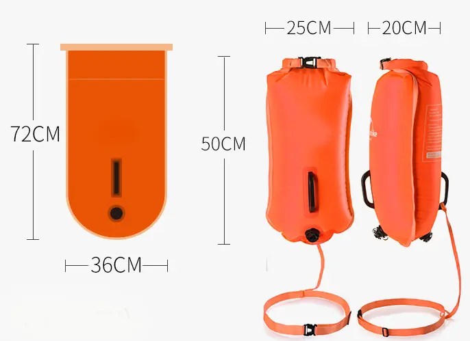 An inflatable swim buoy is an essential piece of equipment for swimmers, triathletes, kayakers, paddleboarders, and snorkelers who swim in open water. As a flotation aid and visibility aid, it enables swimmers to relax while being visible to boats and other swimmers. Additionally, the 28L capacity serves as a waterproof dry bag, allowing swimmers to keep personal items in the water.