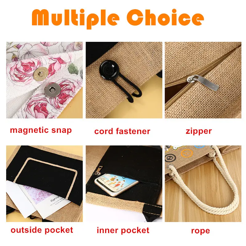One characteristic that sets jute tote bags apart is its circular handle, which combines comfort and design. Depending on the intended appearance and texture, these handles are usually composed of cotton, polyester, or jute. Compared to conventional flat handles, round handles are more pleasant to carry because of their ergonomic shape, which guarantees a smooth grasp and even weight distribution.