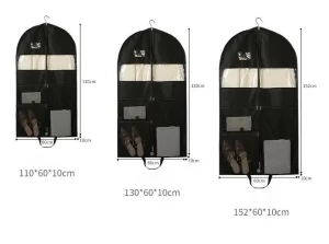 This garment storage bag is made of premium non-woven 80gsm fabric, which offers long-lasting defense against wrinkles, dust, dampness, and insects. It comes in three roomy heights (110, 130, and 152 cm), making it ideal for everything from long gowns to short suits. This garment storage bag is perfect for both organizing and show because to its clever features, which include two clear PVC windows, three mesh zipper pockets, and an additional PVC pocket for labeling.
