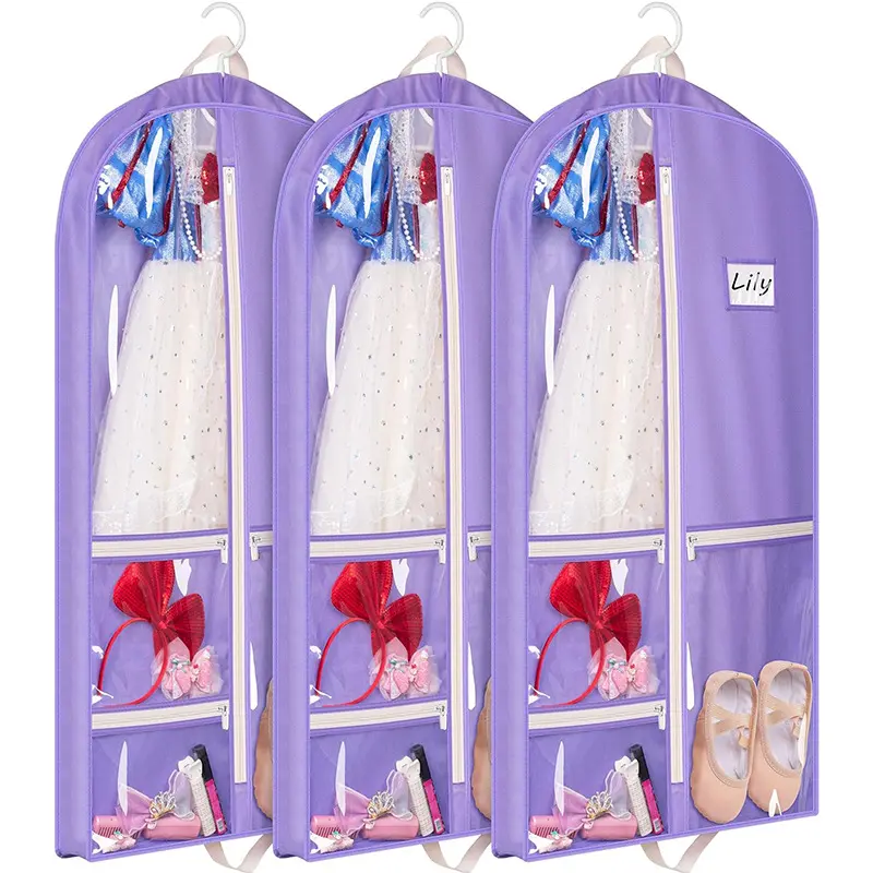 These costume garment bags, which have three front-facing clear PVC pockets, has an integrated storage system that helps keep your accessories and costume organized. It’s ideal for keeping:
